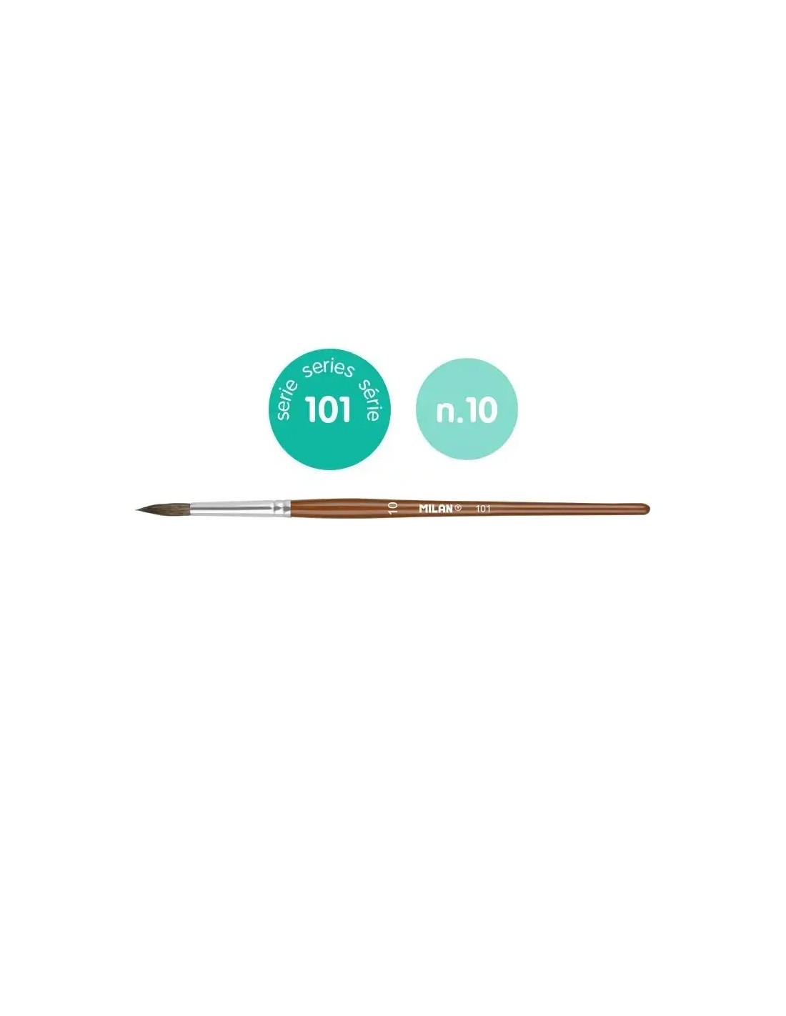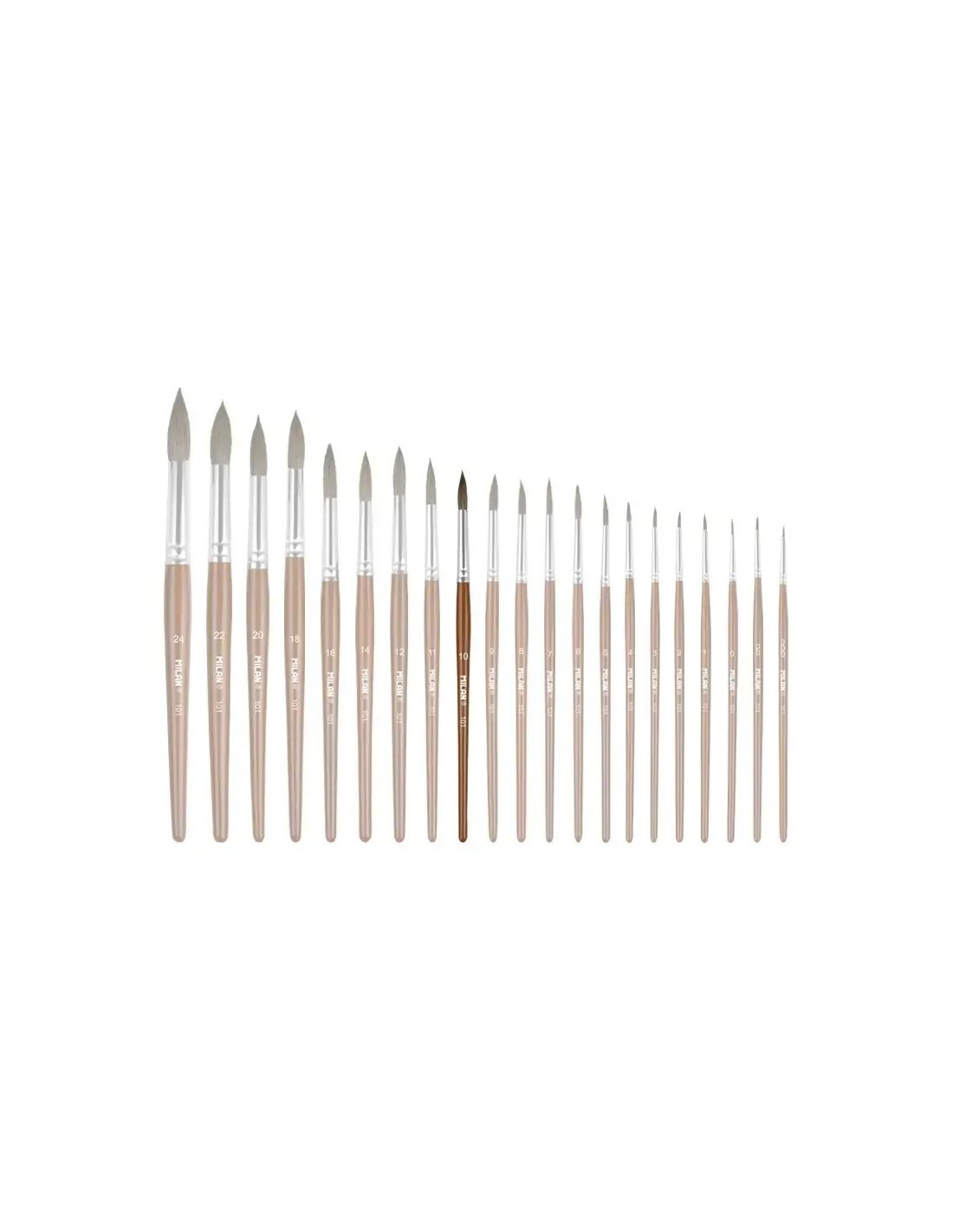 Pincel redondo con mango corto de madera, barnizado en color marrón y virola de aluminio. Composición: 70% pelo natural de cabra + 30% sintético. Adecuado para acuarela, técnicas acuosas y témpera. Diámetro del pelo: 5,2 mm. Longitud del pelo: 23,6 mm. Longitud del pincel: 195 mm.