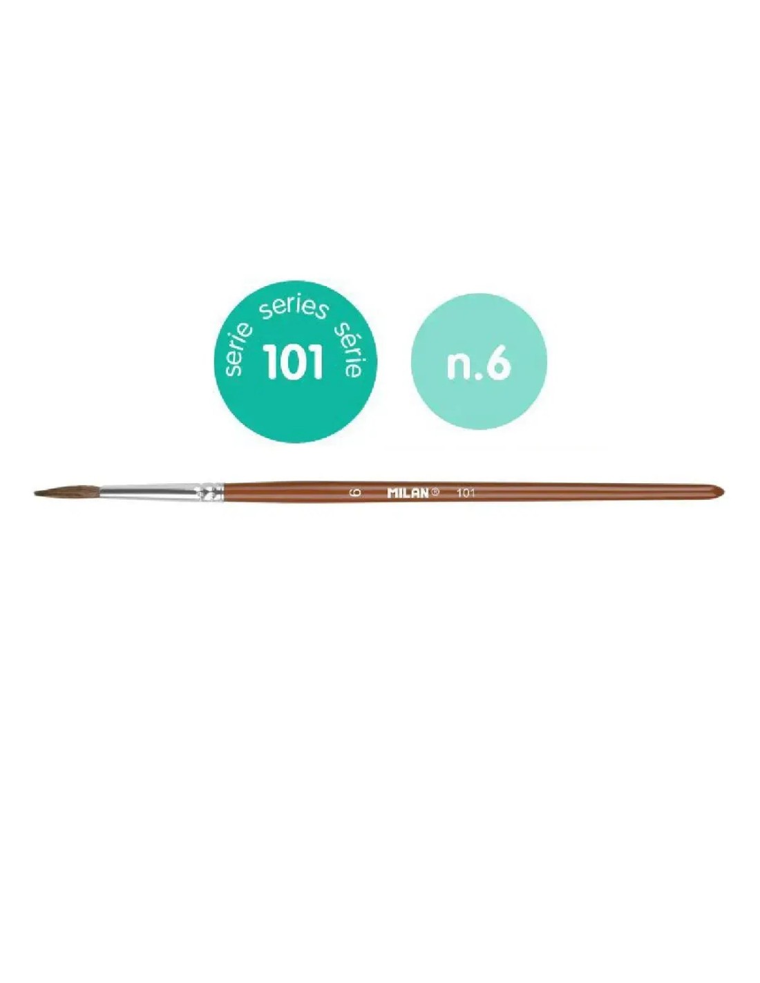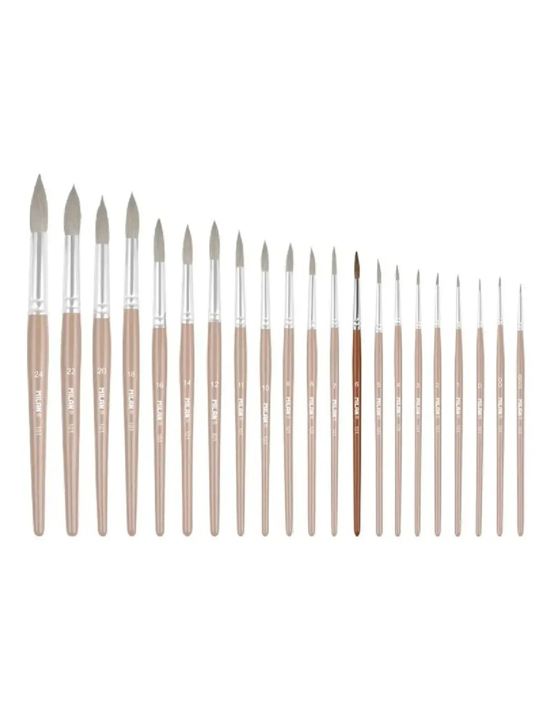 Pincel redondo con mango corto de madera, barnizado en color marrón y virola de aluminio. Composición: 70% pelo natural de cabra + 30% sintético. Adecuado para acuarela, técnicas acuosas y témpera. Diámetro del pelo:3,7 mm. Longitud del pelo: 17 mm. Longitud del pincel: 180 mm.