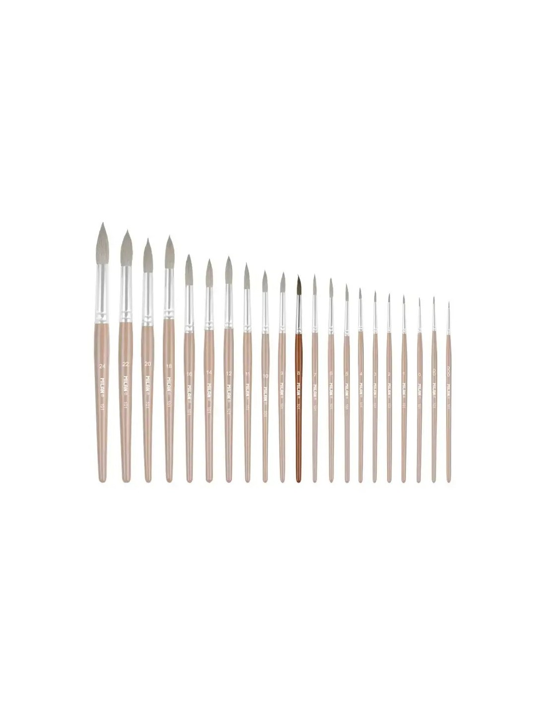Pincel redondo con mango corto de madera, barnizado en color marrón y virola de aluminio. Composición: 70% pelo natural de cabra + 30% sintético. Adecuado para acuarela, técnicas acuosas y témpera. Diámetro del pelo:4,5 mm. Longitud del pelo: 20,6 mm. Longitud del pincel: 182 mm.
