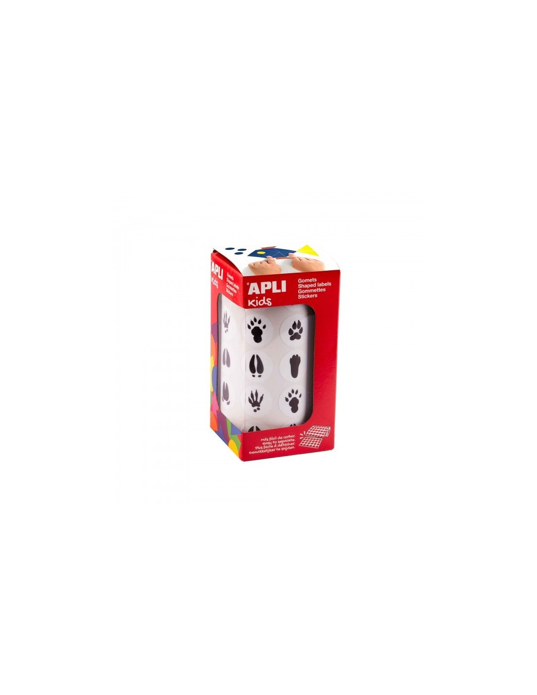 Cada rollo contiene 30 hojas pretroqueladas para una fácil separación, con un total de 900 gomets por rollo en formas de huellas de distintos animales: corzo, ciervo, liebre, tejón, oso, gamuza, jabalí, ardilla, comadreja, zorro, lobo, búho y rana.
