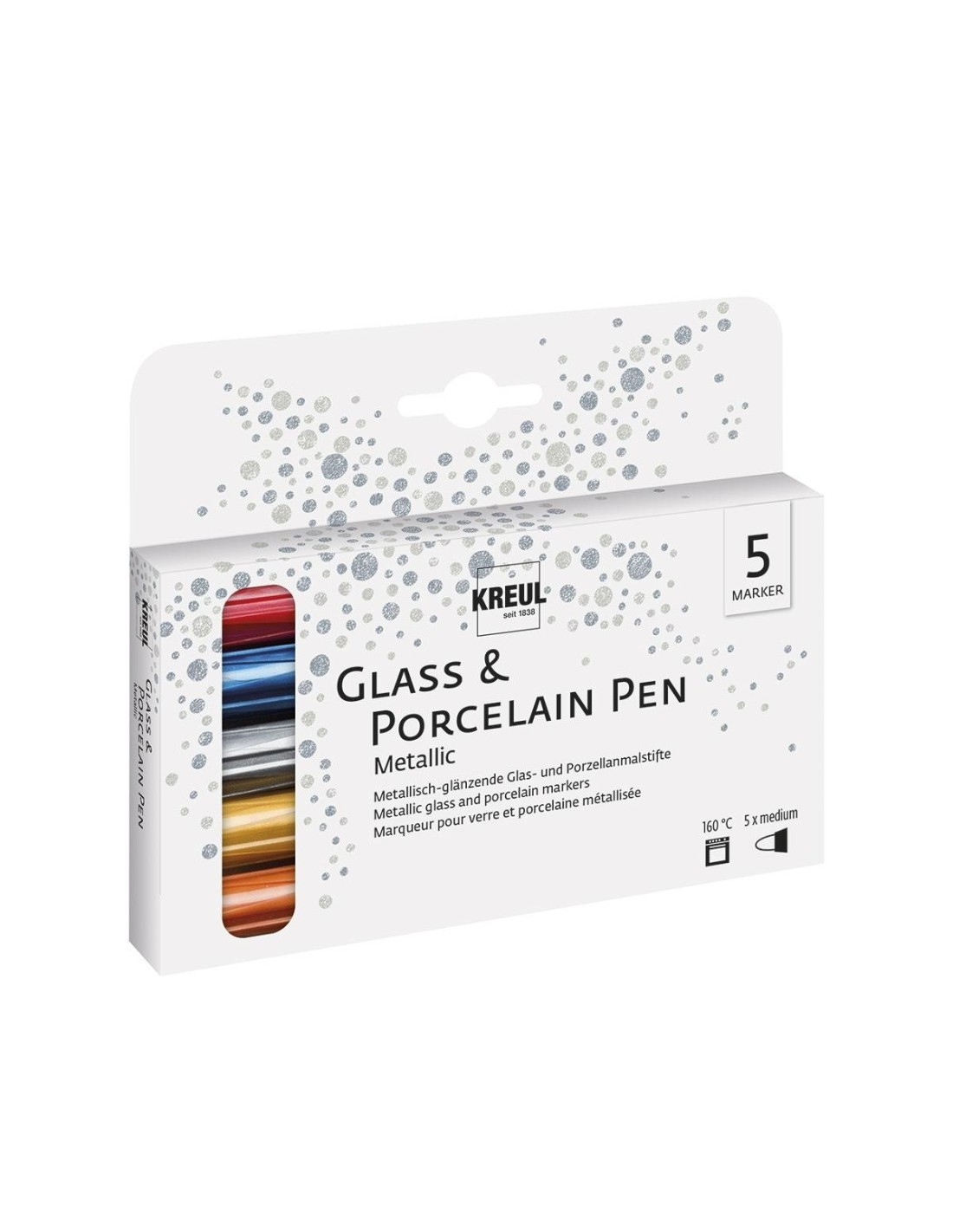 5 rotuladores, colores metálicos: Oro, plata, cobre, azul y rojo.