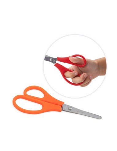 Empuñadura de plástico que permite a los niños utilizar dos dedos en uno de sus anillos lo que ofrece un mayos confort al momento de cortar.